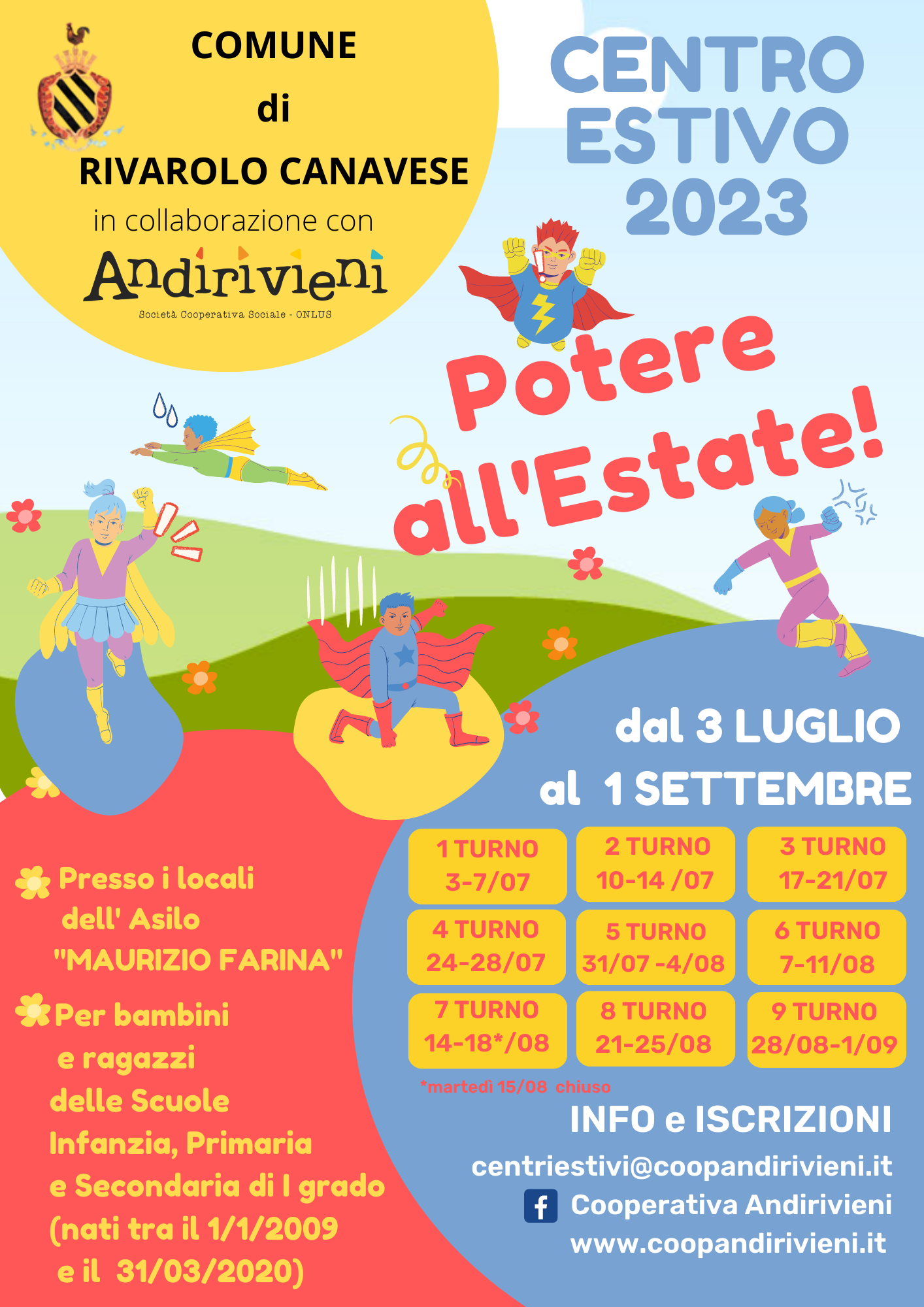 Sono aperte le iscrizioni per il centro estivo 2023 "Potere all'estate!" che si svolgerà presso i locali del M. Farina ed è rivolto ai bambini e ragazzi delle scuole dell' Infanzia, primaria e secondaria di I° grado (nati tra il 01/01/2009 e il 31/03/2020)