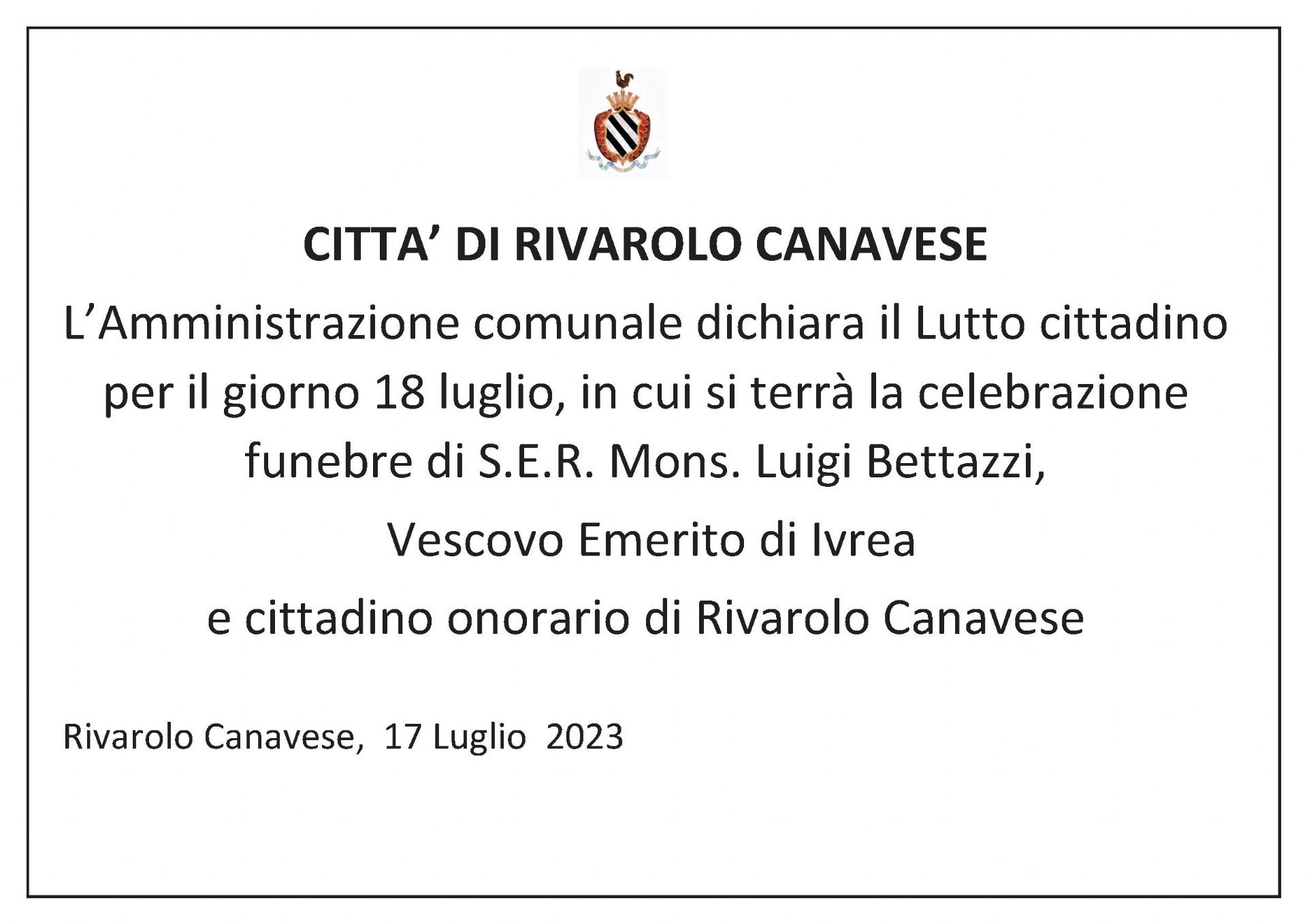 Descrizione Martedì 18 luglio 2023 Allegati Documenti Lutto cittadino [.pdf 401,26 Kb - 18/07/2023] A cura di Protocollo Ultimo aggiornamento pagina: 18/07/2023 13:55:02