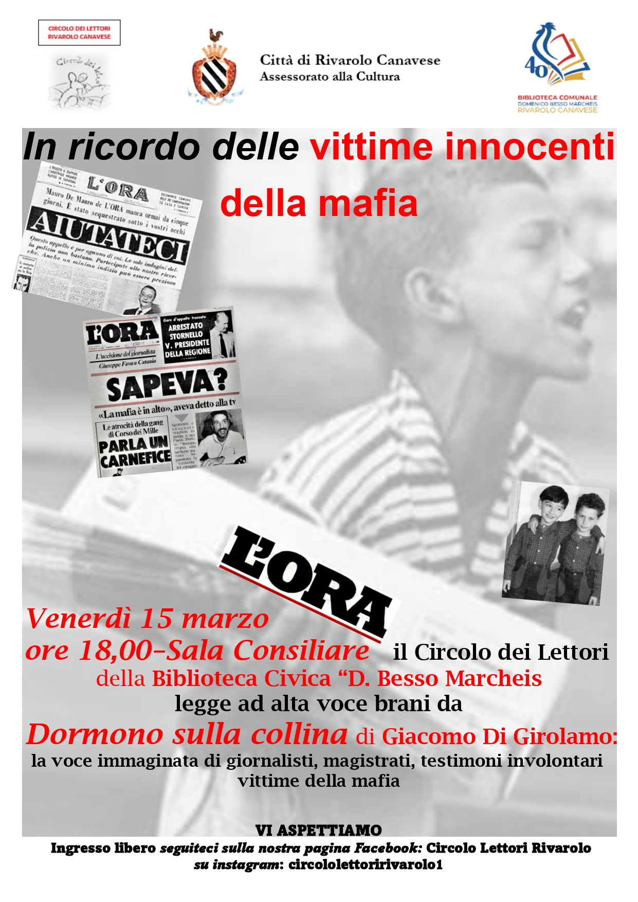Venerdì 15 marzo alle ore 18, presso la sala consiliare del Municipio in via Ivrea 60, il Circolo dei Lettori della Biblioteca “Domenico Besso Marcheis” propone alcuni brani ad alta voce tratti da “Dormono sulla collina. 1969-2014” di Giacomo Di Girolamo per ricordare i giornalisti Mauro De Mauro, Giovanni Spampinato, Pippo Fava, Giancarlo Siani, i magistrati Bruno Caccia e Rocco Chinnici e altre vittime delle stragi della criminalità organizzata.