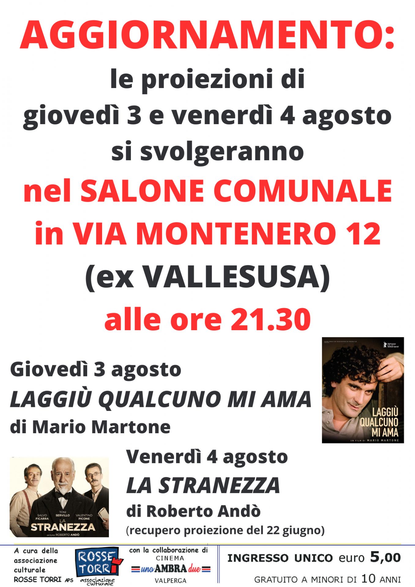 Causa incertezza condizioni meteo, le proiezioni della rassegna "Cinema al Castello" di giovedì 3 e venerdì 4 agosto si svolgeranno presso il SALONE COMUNALE in VIA MONTENERO 12 (complesso ex cotonificio VALLESUSA), alle ore 21.30.