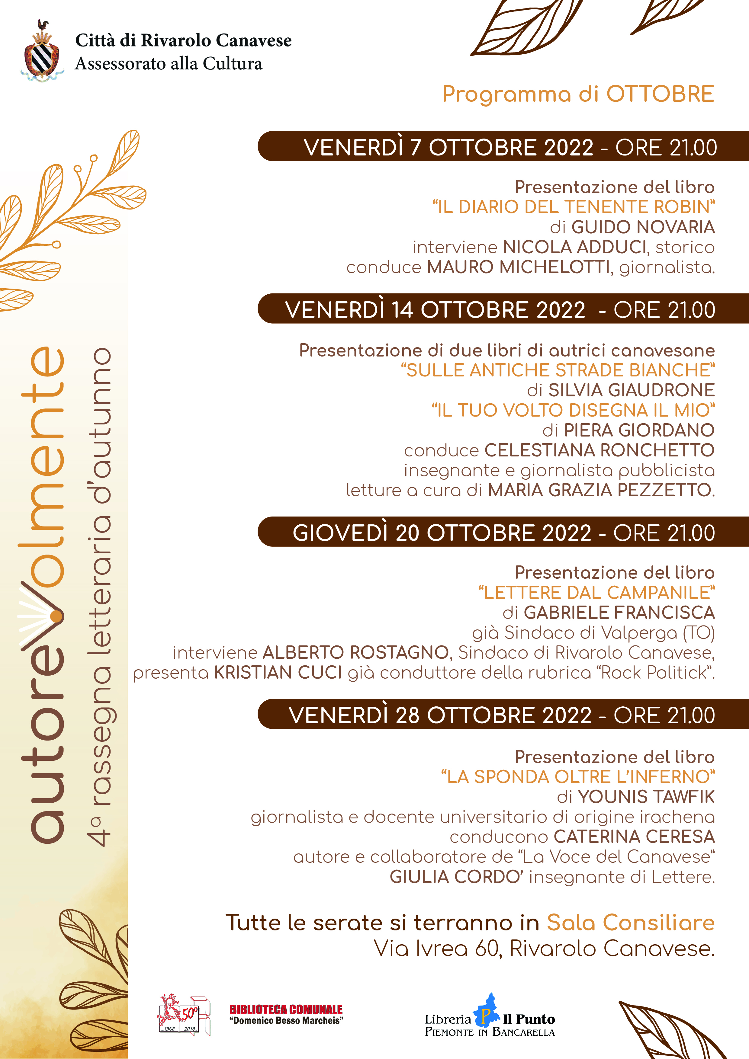Tutti gli appuntamenti si svolgeranno alle ore 21.00 presso la Sala Consiliare del Municipio di Rivarolo Canavese – Via Ivrea 60 – ingresso libero