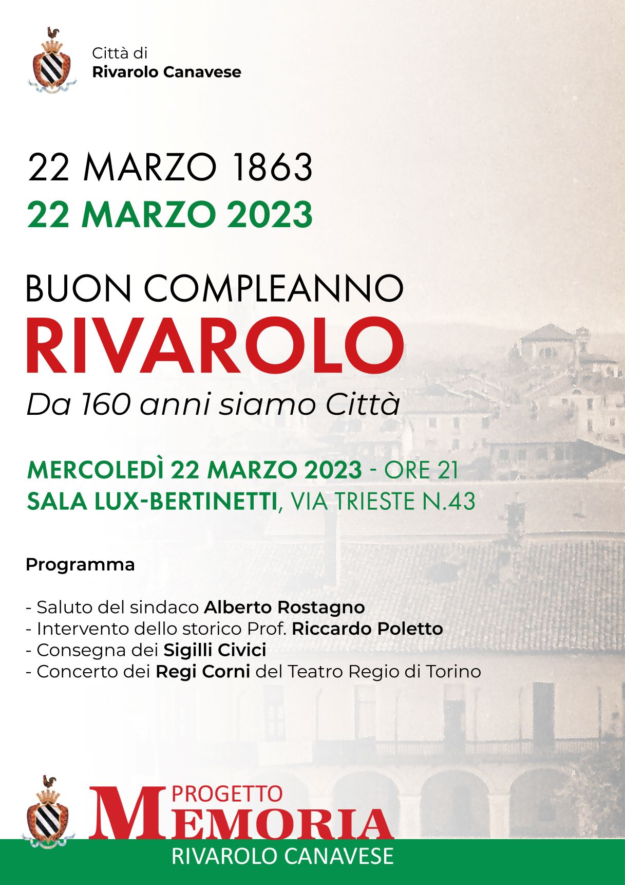 160 anni fa, il 22 marzo 1863, Re Vittorio Emanuele II, concedeva a Rivarolo Canavese il titolo di Città in virtù della sua importanza storica, artistica, culturale, civica e demografica. Il Progetto Memoria Rivarolo, ideato dal consigliere comunale Guido Novaria, è un percorso che unisce il passato al presente e ci proietta con fiducia al futuro; il 22 marzo è il giorno più significativo del Progetto di Memoria, l’anniversario della concessione del titolo, il compleanno della nostra Città.