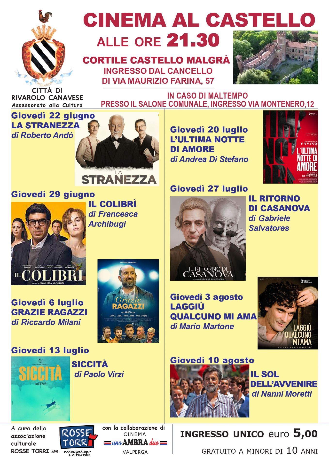 Dal 22 giugno al 10 agosto il cortile del Castello Malgrà a Rivarolo Canavese diventa suggestiva arena all’aperto per il cartellone di otto proiezioni organizzato dall’associazione culturale Rosse Torri in collaborazione con il Cinema Ambra di Valperga.