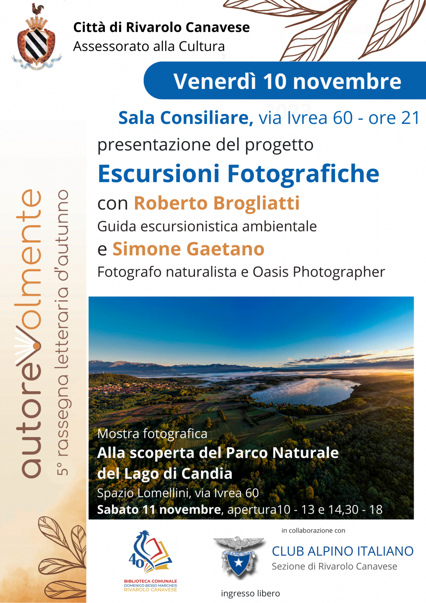 Venerdì 10 novembre, alle 21 in Sala consiliare, Simone Gaetano, fotografo naturalista, e Roberto Brogliatti, guida escursionistica ambientale, presenteranno “Escursioni Fotografiche”, progetto dedicato alla consapevole riscoperta dell’ambiente naturale con attenzione all’ecologia e al comportamento animale. La serata sarà incentrata sul parco naturale del Lago di Candia.