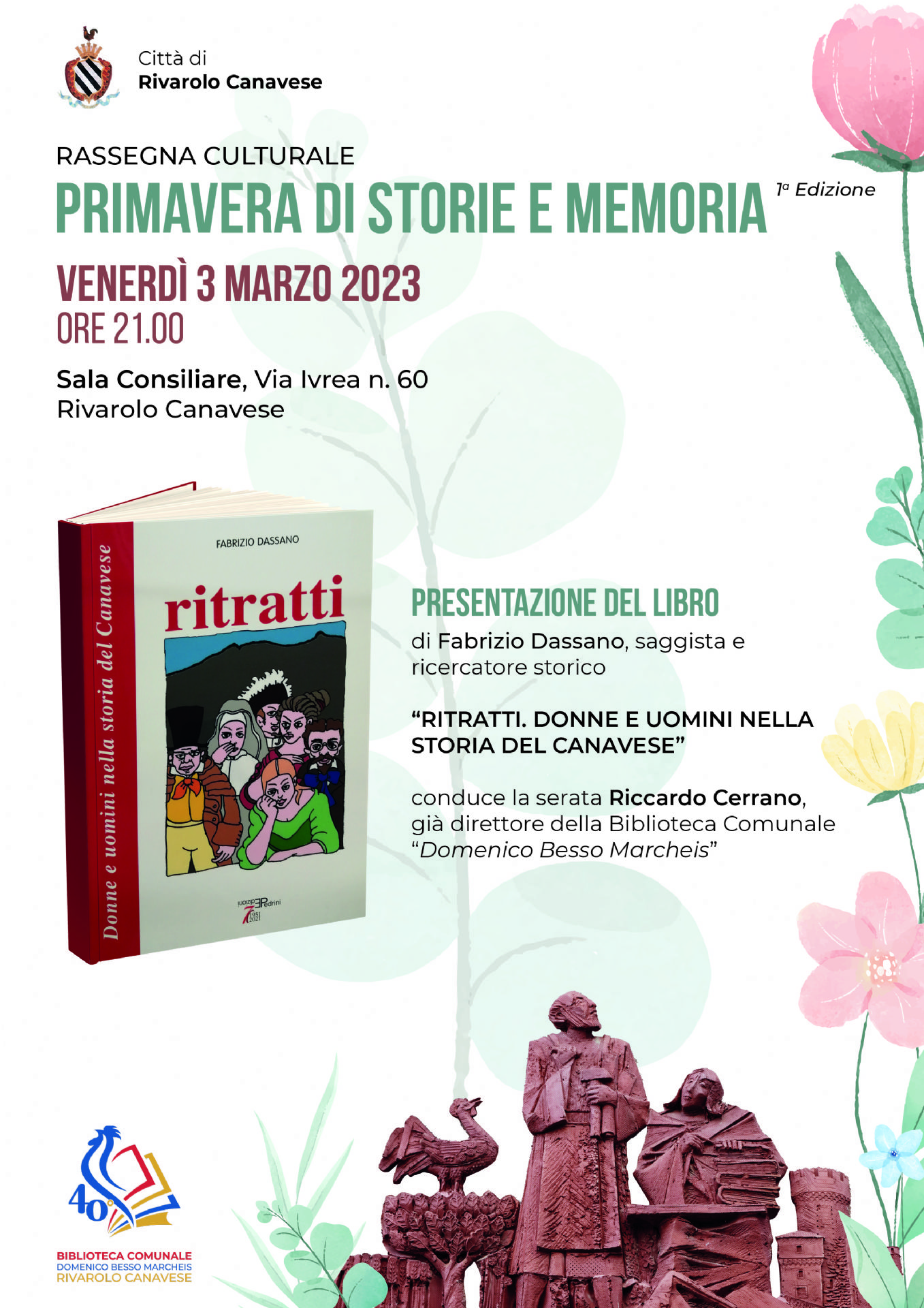 Fabrizio Dassano, ricercatore storico, presenterà “Ritratti” (Edizioni Pedrini) una rassegna di donne e uomini nella storia del Canavese, dal medioevo al ‘900. Un’opera che si innesta nella tradizione di biografie canavesane, come quelle di Federico Perinetti e Angelo Paviolo, ma che aggiunge interessanti elementi soprattutto su alcune figure femminili: da Ermengarda, governatrice di Ivrea nel X secolo, fino a Maria Maddalena Yon, protagonista della RAI degli esordi. In dialogo con Riccardo Cerrano, già direttore della Biblioteca comunale di Rivarolo, l’autore si soffermerà in particolare su alcune figure rivarolesi.
