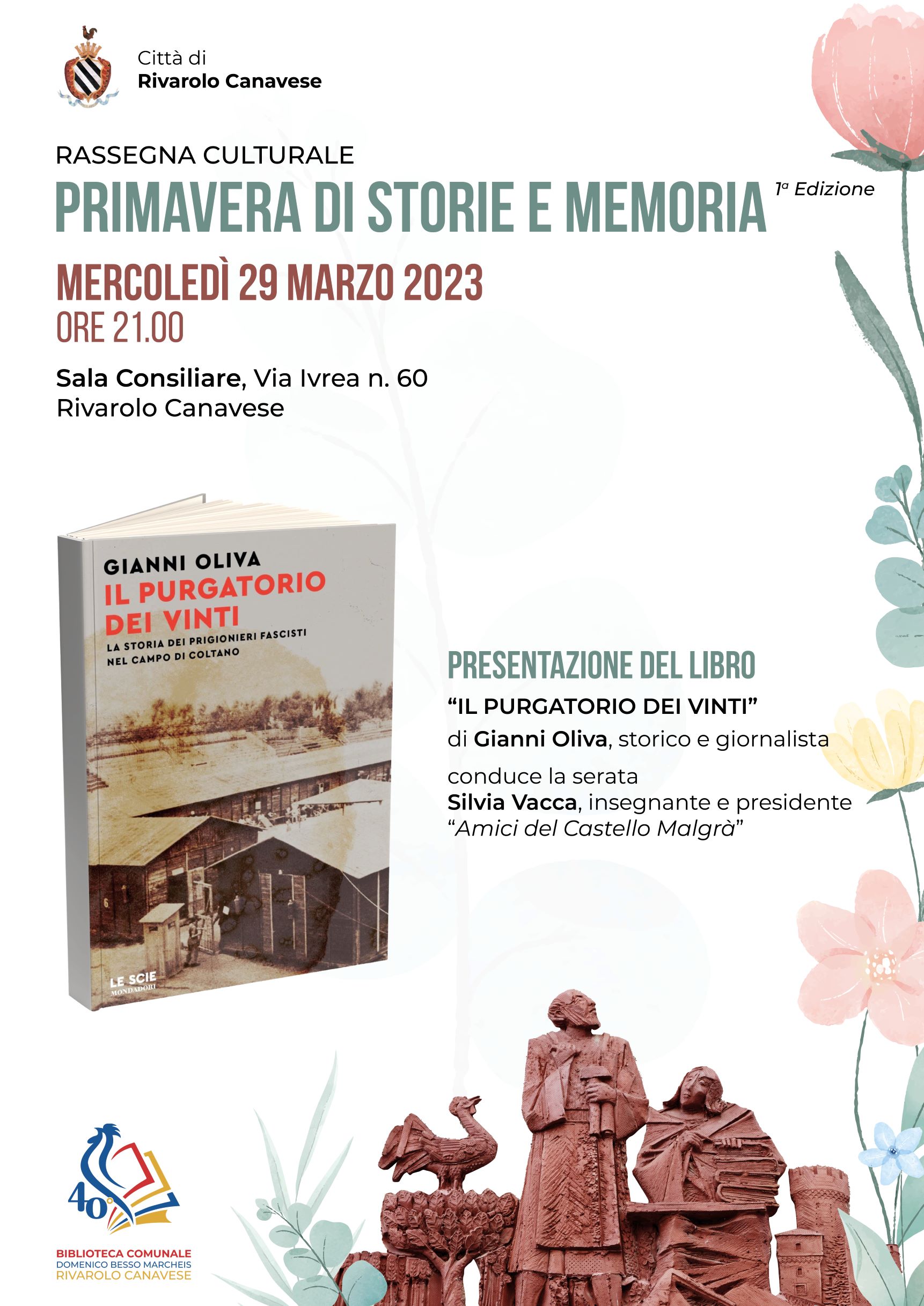Mercoledì 29 marzo alle 21.00 in Sala consiliare, lo storico e giornalista Gianni Oliva presenta “Il purgatorio dei vinti” (Mondadori), dedicato ai fascisti della Repubblica Sociale Italiana che furono imprigionati nel campo allestito dagli Alleati a Coltano, presso Pisa. Tra testimonianze e documentazione scientifica, ricordando anche nomi noti come Raimondo Vianello, Walter Chiari, Enrico Maria Salerno, Oliva presenta la vicenda di Coltano non come il campo di prigionia di ex combattenti nostalgici, ma come lo specchio dello smarrimento ideologico e morale lasciato nelle coscienze dal 1943-45. Conduce la serata Silvia Vacca, insegnante e presidente dell’associazione Amici del Castello Malgrà.