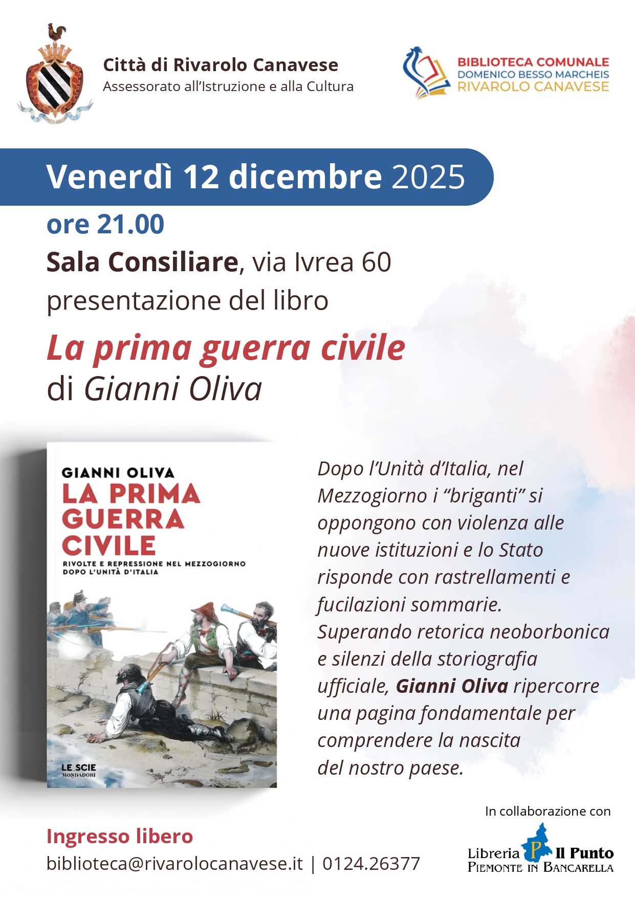“Siamo felici di ritrovare il prof. Oliva con una nuova opera dedicata a ricostruire una fase fondamentale della storia italiana, utile anche a comprendere divisioni che purtroppo caratterizzano ancora il nostro presente” commenta il Vicesindaco Marina Vittone segnalando che “l’importanza nell’analisi storica, quanto nell’attualità, di tentare di comprendere la complessità, senza limitarsi ad analisi superficiali”.