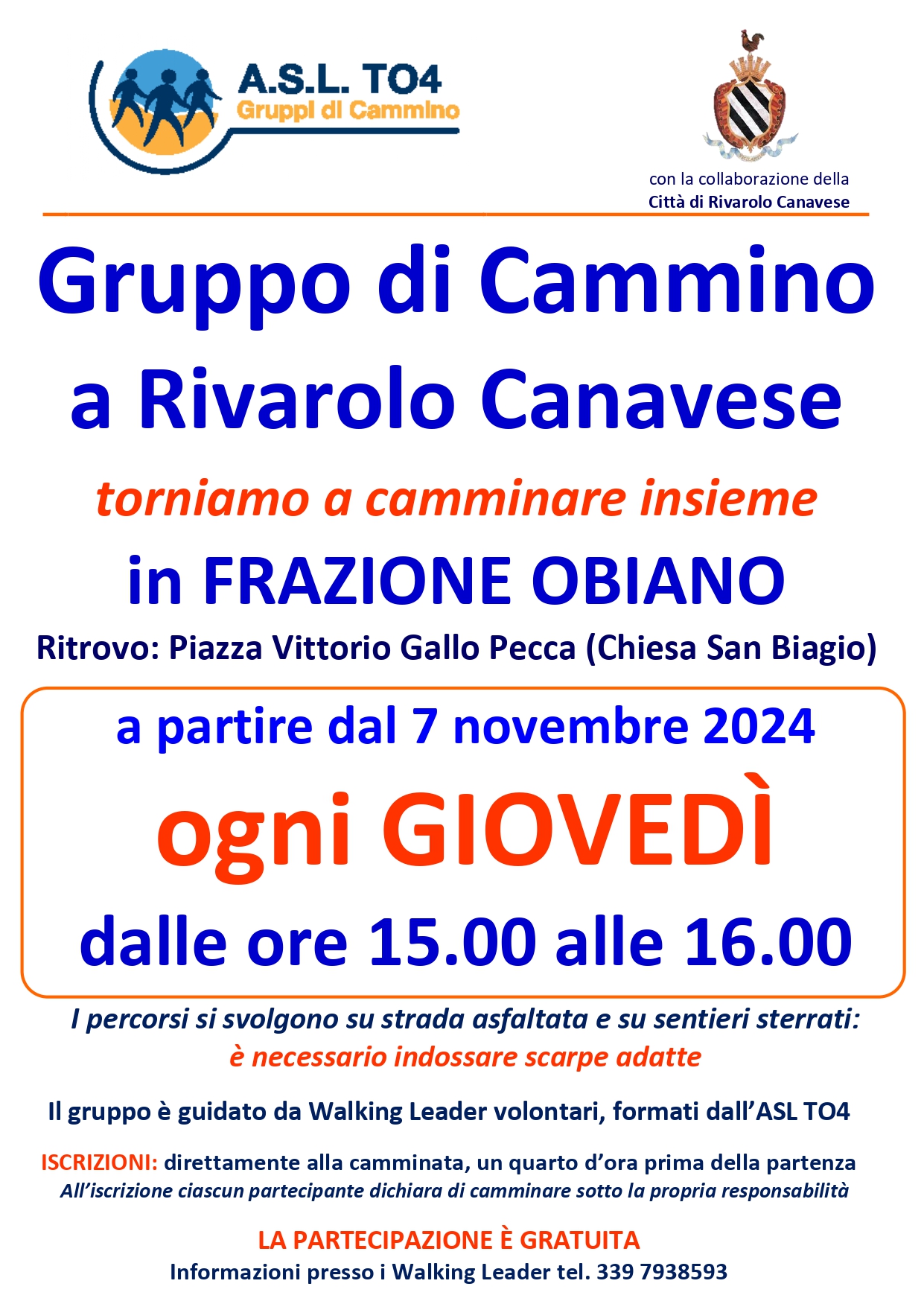 Il Comune di Rivarolo Canavese aderisce al progetto “Gruppi di cammino” dell’ASL TO4, finalizzato al contrasto alla sedentarietà e per promuovere il benessere attraverso l’attività fisica.