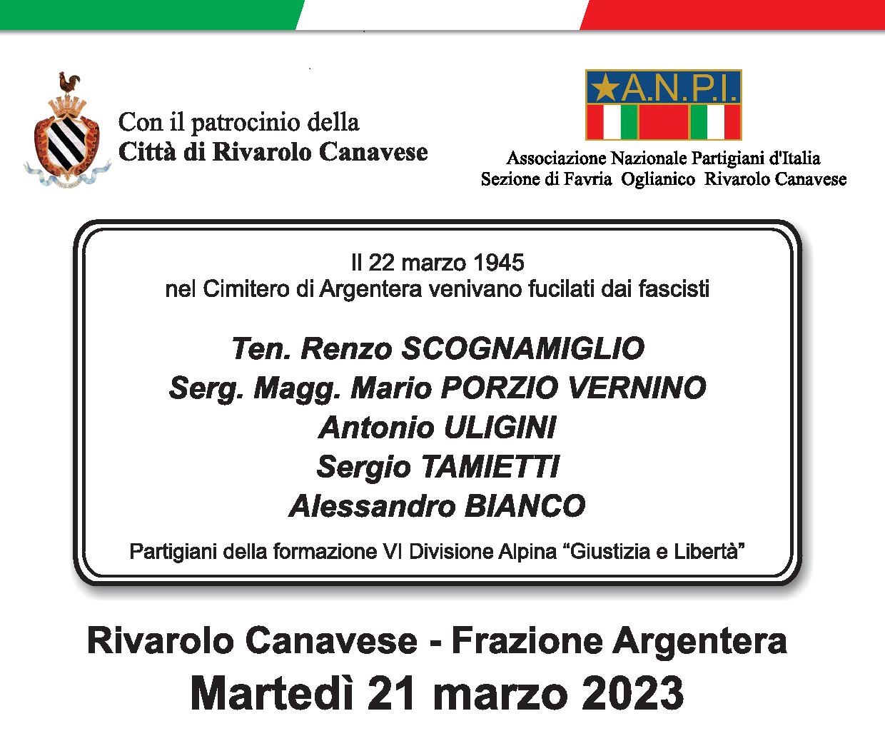 Descrizione 73° Anniversario Partigiani Caduti Costo Gratuito Allegati Documenti Locandina [.pdf 463,03 Kb - 15/03/2023] Contatti Nome Descrizione Email comune@rivarolocanavese.it Telefono 0124.454611 Ultimo aggiornamento pagina: 15/03/2023 13:01:11