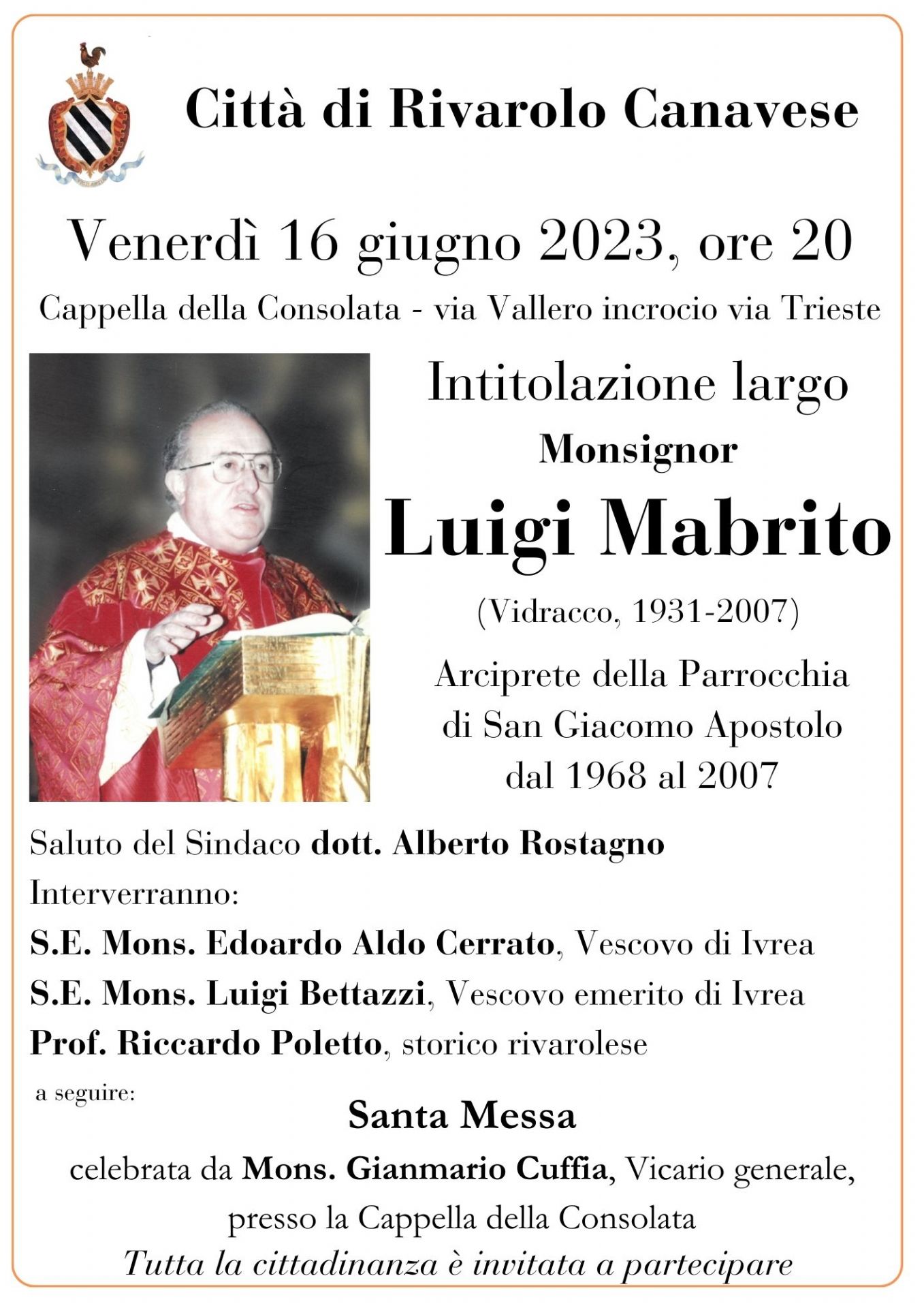 Venerdì 16 giugno 2023 alle ore 20, a Rivarolo Canavese, il sagrato della Cappella della Consolata, tra via Vallero e via Trieste, sarà intitolato a mons. Luigi Mabrito, Arciprete della Parrocchia di San Giacomo Apostolo dal 1968 al 2007.
