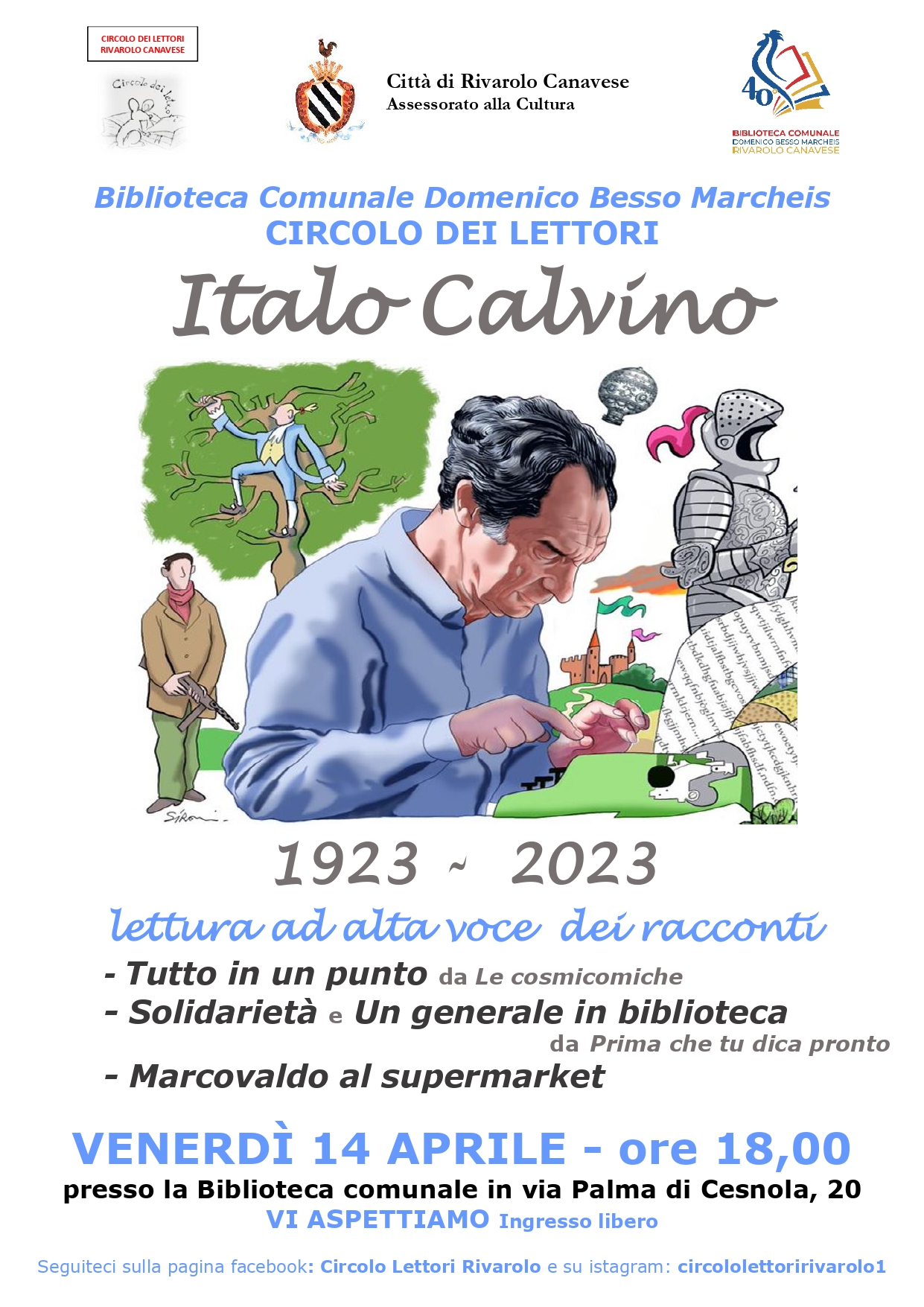 Venerdì 14 aprile, alle ore 18,00 presso la Biblioteca comunale "Domenico Besso Marcheis" il Circolo dei Lettori celebra il centenario di Italo Calvino (Santiago de Las Vegas, Cuba, 1923 - Siena 1985) con la lettura ad alta voce di alcuni racconti tratti da Le cosmicomiche, Prima che tu dica pronto e Marcovaldo.