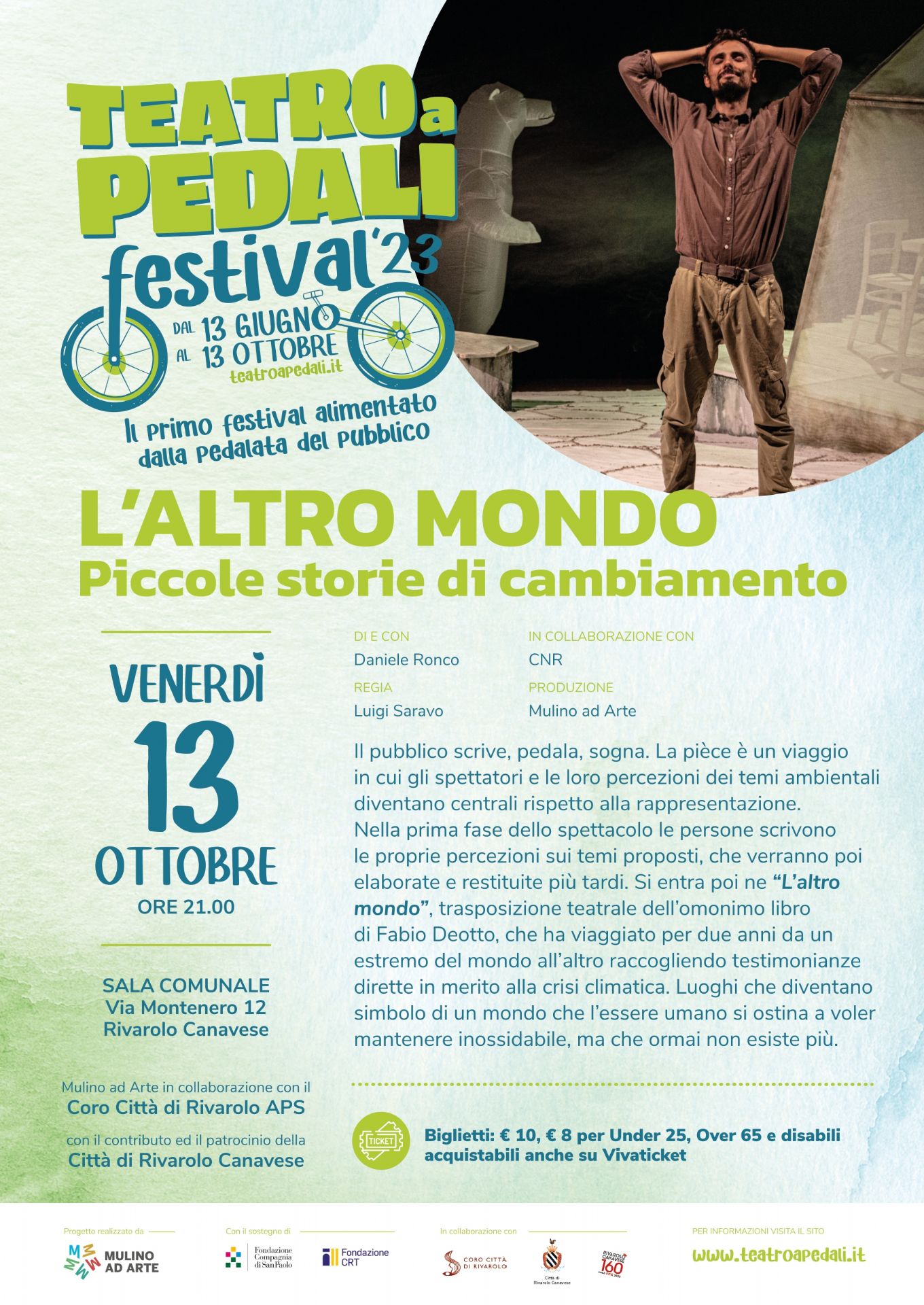 Venerdì 13 ottobre alle ore 21 presso il salone comunale di via Montenero 12 a Rivarolo Canavese (complesso ex Vallesusa - ex centro vaccini) la compagnia Mulino ad Arte presenterà L'ALTRO MONDO - Piccole storie di cambiamento, spettacolo di e con Daniele Ronco, per la regia di Luigi Saravo, realizzato in collaborazione con il CNR. Ultima data del festival Testro a pedali, con spettacoli alimentati dalla pedalata del pubblico: l'energia elettrica per luci e altri impianti scenici sarà infatti prodotta da 15 biciclette collegate ad un circuito di cogenerazione: gli spettatori, a turno, assicureranno quindi l’impatto energetico zero dello spettacolo.