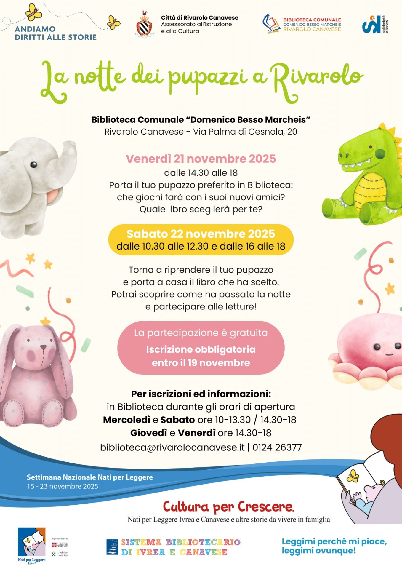 Programma promosso dal Sistema Bibliotecario di Ivrea e Canavese per la Settimana Nazionale Nati per Leggere che dal 15 al 23 novembre 2025 prevede in tutta Italia momenti di lettura e incontri di sensibilizzazione con le famiglie per sostenere il Diritto alle storie delle bambine e dei bambini.
