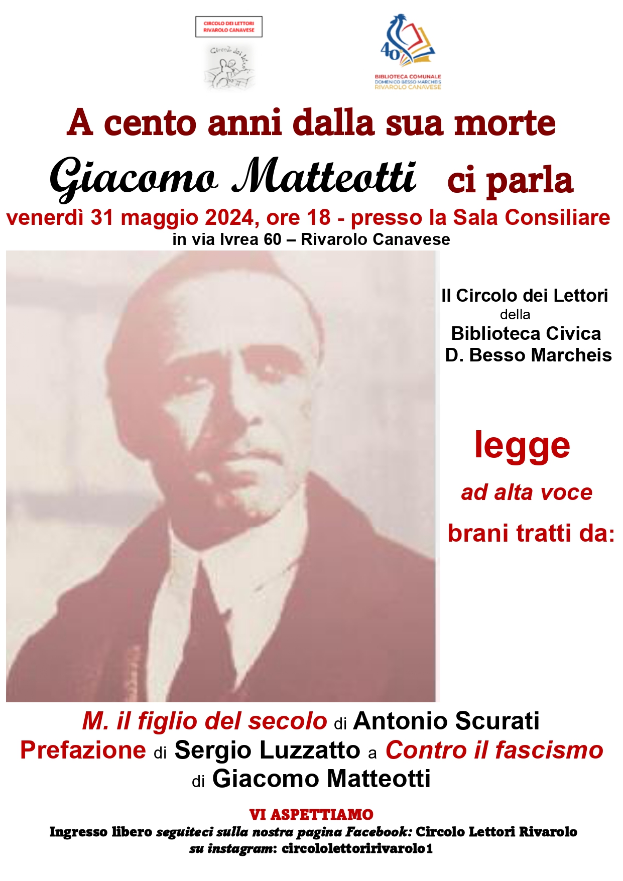 Venerdì 31 maggio 2024 alle ore 18 presso la Sala Consiliare (via Ivrea 60) si terranno le Letture ad alta voce a cura del Circolo dei Lettori della Biblioteca per ricordare la figura di Giacomo Matteotti, a 100 anni dalla scomparsa.