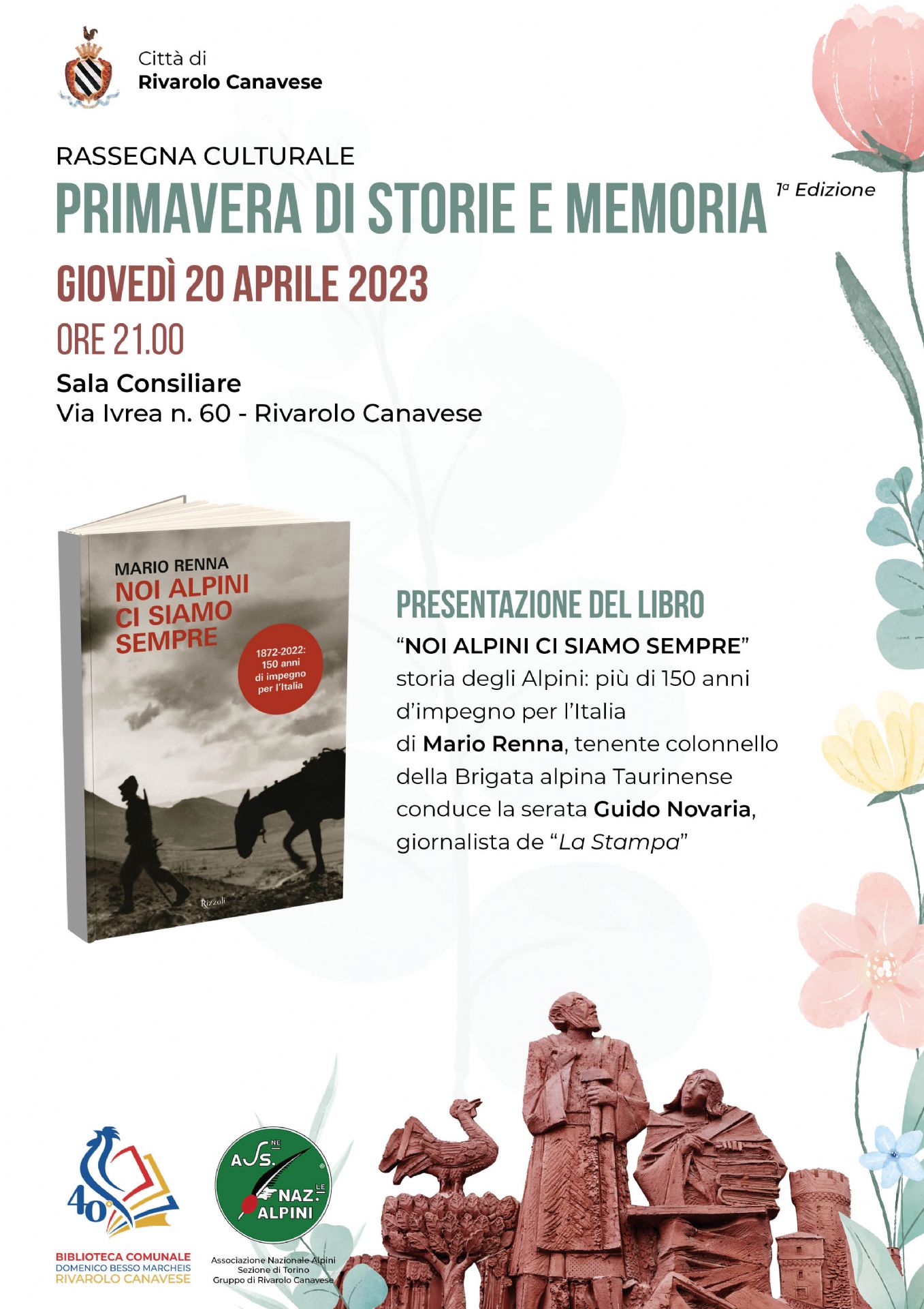 Giovedì 20 aprile in Sala Consiliare alle ore 21, Mario Renna, Tenente Colonnello della Brigata alpina Taurinense, presenterà il libro Noi Alpini ci siamo sempre (Rizzoli, 2022).