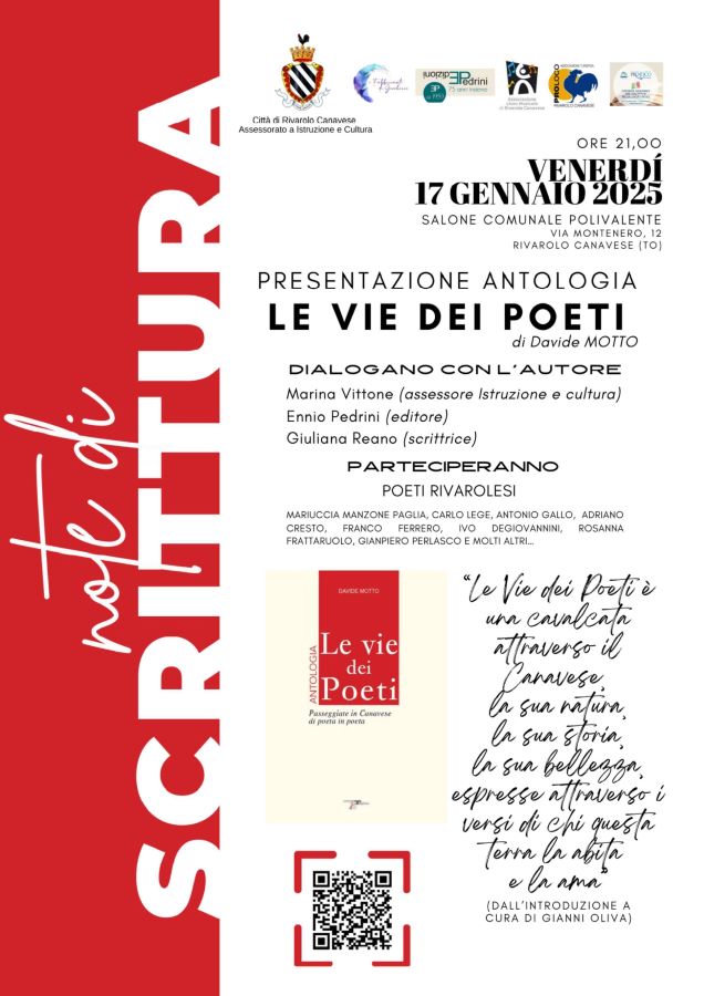 L'autore, Davide Motto, presenterà la sua antologia "Le vie dei poeti. Passeggiate in Canavese di Poeta in Poeta”: dialogheranno con l'autore Marina Vittone, Vicesindaco e Assessore a Istruzione e Cultura, Ennio Pedrini editore e Giuliana Reano scrittrice.