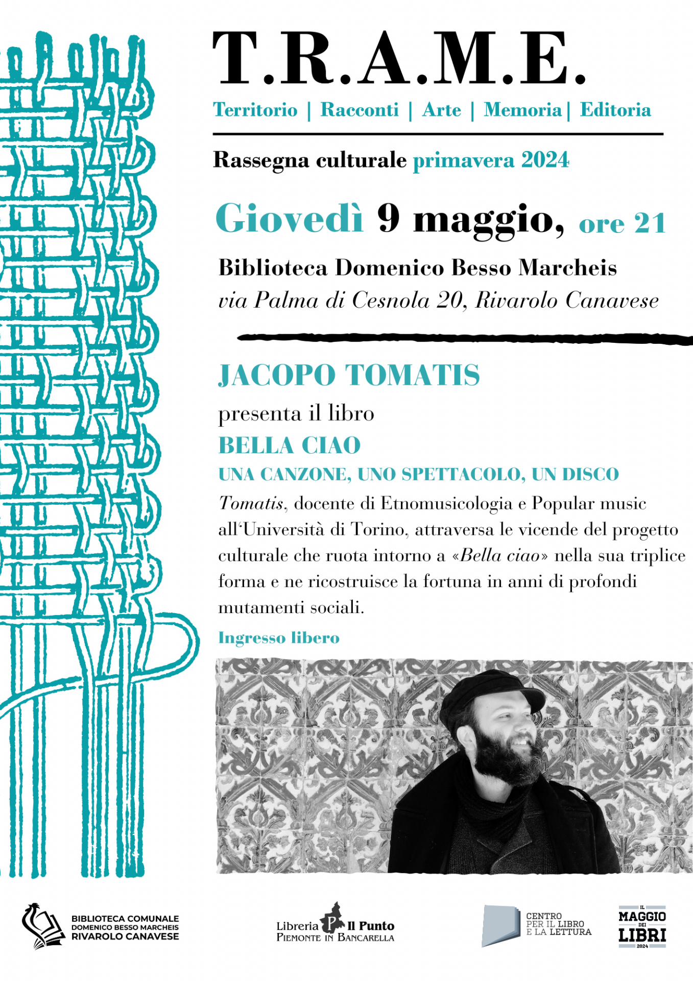 Giovedì 9 maggio alle ore 21, Jacopo Tomatis proporrà Bella Ciao. Una canzone, uno spettacolo, un disco (il Saggiatore, 2024).