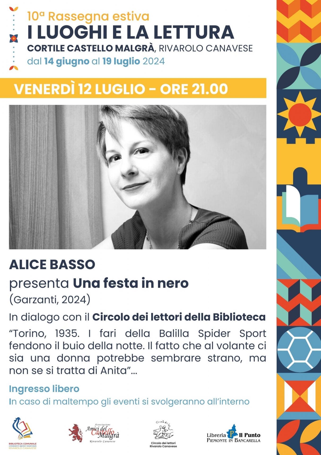 Venerdì 12 luglio alle ore 21.00 grande attesa per il ritorno a Rivarolo di Alice Basso con il romanzo conclusivo della fortunata serie con protagonista Anita Bo: Una festa in nero (Garzanti, 2024).