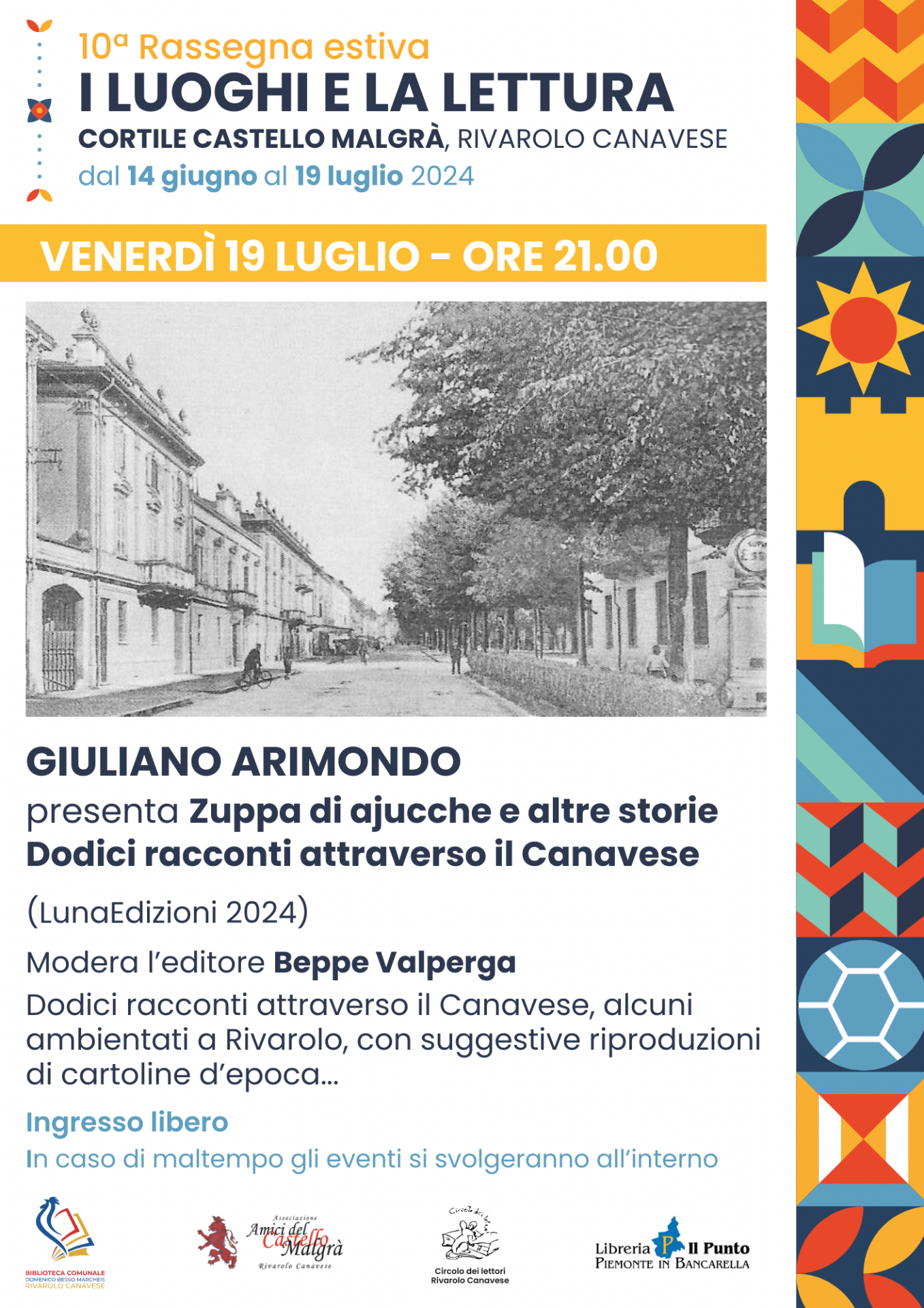 Ultimo incontro della rassegna con l’autore Giuliano Arimondo per la presentazione di Zuppa di ajucche e altre storie. Dodici racconti attraverso il Canavese (LunaEdizioni 2024), venerdì 19 luglio alle ore 21.00.