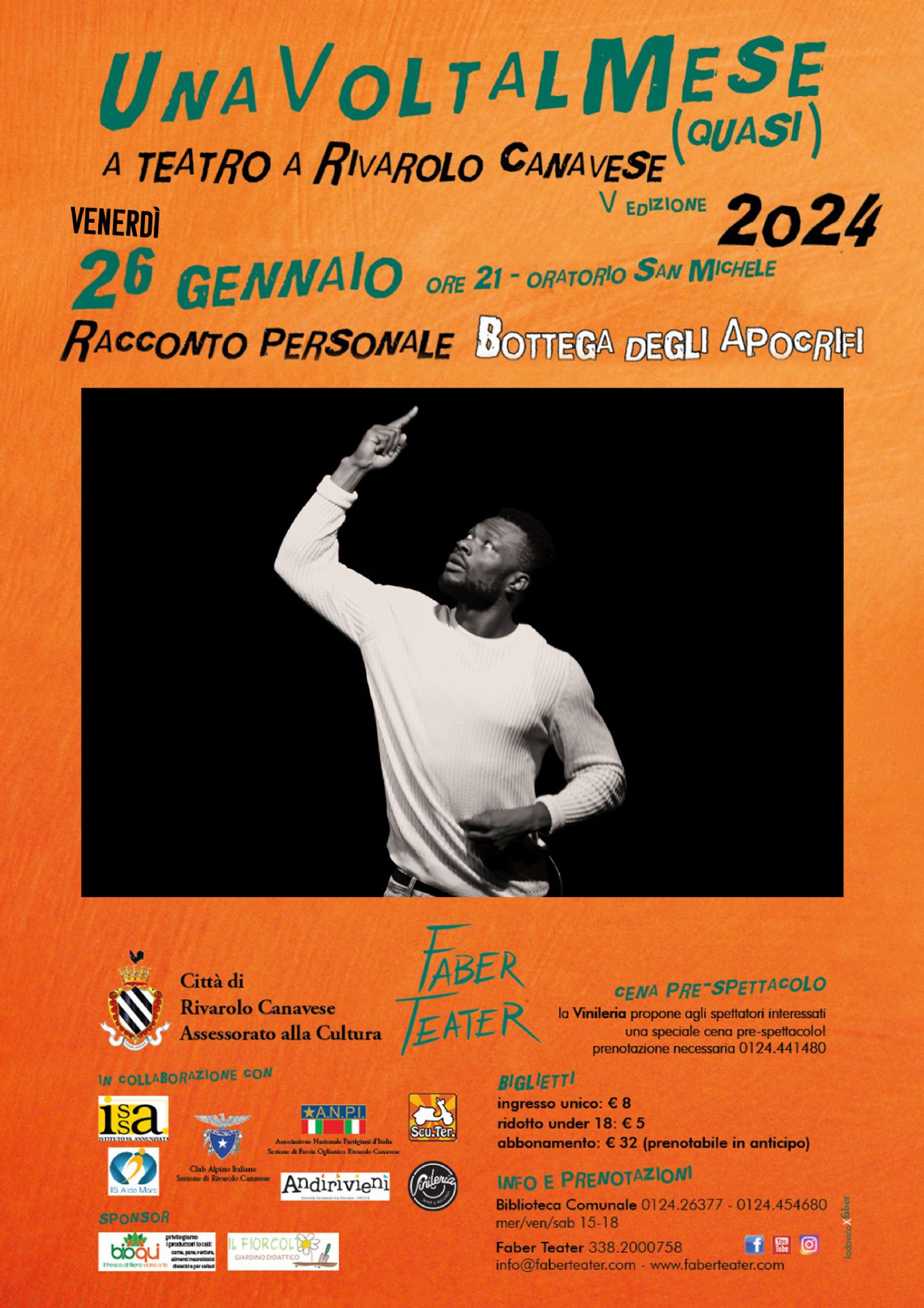 Continua a Rivarolo Canavese la rassegna teatrale UnaVoltalMese (quasi): venerdì 26 gennaio 2024 alle ore 21, presso il Teatro Oratorio di San Michele in via Fiume 15 - Mamadou Diakité proporrà il suo Racconto personale.