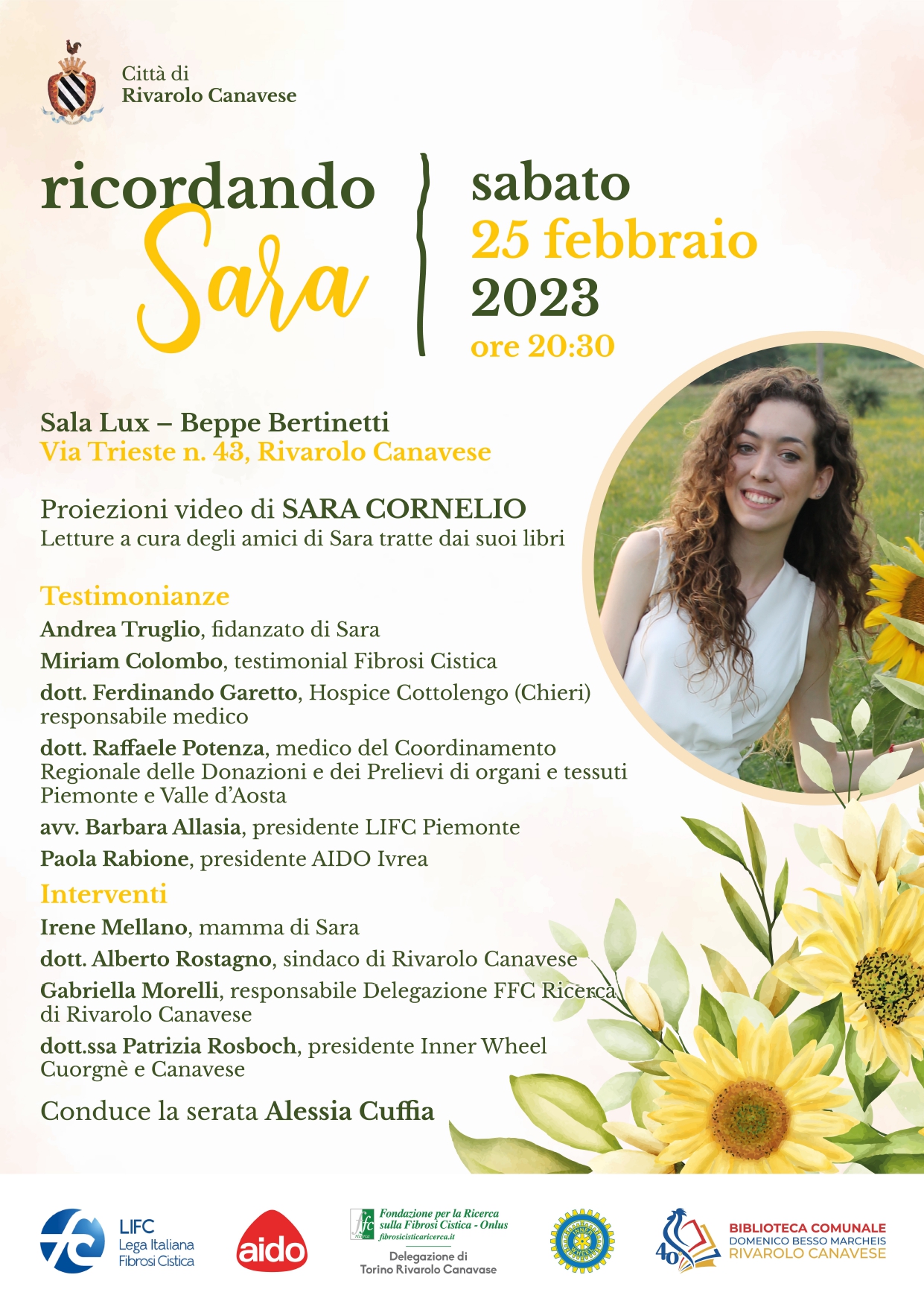 Sabato 25 febbraio 2023, alle ore 20.30 presso la sala “Lux-Beppe Bertinetti” in via Trieste 43 a Rivarolo Canavese, “Ricordando Sara”: un appuntamento in memoria di Sara Cornelio, scomparsa un anno fa a soli 23 anni, dopo aver convissuto sin da bambina con la fibrosi cistica.