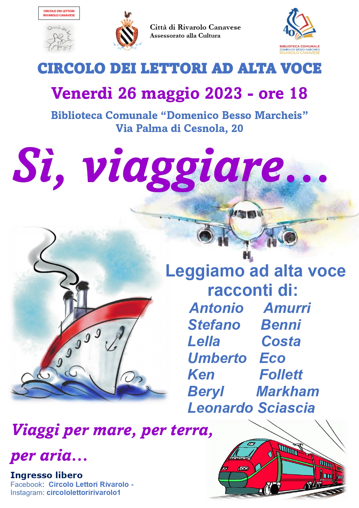 Il Circolo dei Lettori ad alta voce della Biblioteca Comunale "Domenico Besso Marcheis" propone venerdì 26 maggio alle ore 18 brani dedicati a viaggi per terra, aria e mare. Saranno proposti brani di Antonio Amurri, Stefano Benni, Lella Costa, Umberto Eco, Ken Follet, Leonardo Sciascia.