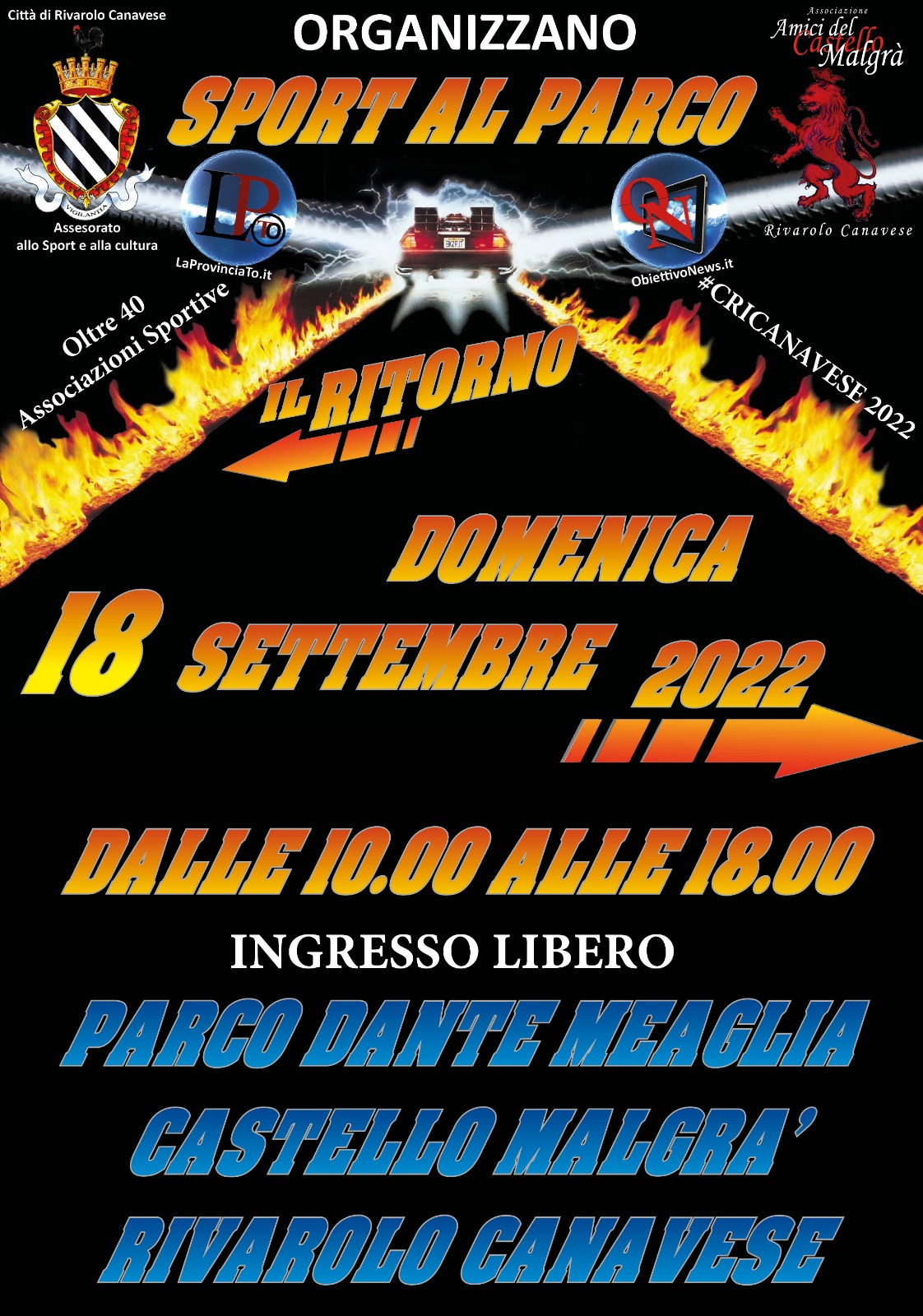 Dalle 10,00 alle 19,00 oltre 50 associazioni sportive del territorio presenteranno le proprie attività, con possibilità di sperimentare le varie discipline: atletica, podismo, attività subacquee, volley, tiro con arco, baseball, quidditch, danza e arti circensi, country, karate, basket, scherma, pattinaggio, taekwondo, ginnastica, ginnastica militare e ginnastica ritmica, boxe, kickboxing, judo, nordic walking, bocce, trial, softair, pony ed educazione cinofila.