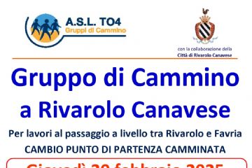 Per lavori al passaggio a livello tra Rivarolo Canavese e Favria, il punto di ritrovo del Gruppo di Cammino del 20 febbraio 2025 è in Frazione Vesignano - piazza Martiri del Martinetto presso...