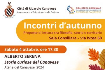 Sabato 4 ottobre alle 17.30, presso la Sala consiliare del Municipio, Alberto Serena presenterà “Storie curiose del Canavese”: una raccolta di racconti edita da Atene del Canavese nel 2024 con...