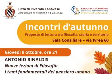 Giovedì 9 ottobre, alle ore 21, presso la Sala consiliare in via Ivrea 60, Antonio Rinaldis, docente di filosofia presso L'Istituto "Aldo Moro di Rivarolo Canavese": "Nuove lezioni di Filosofia. I...