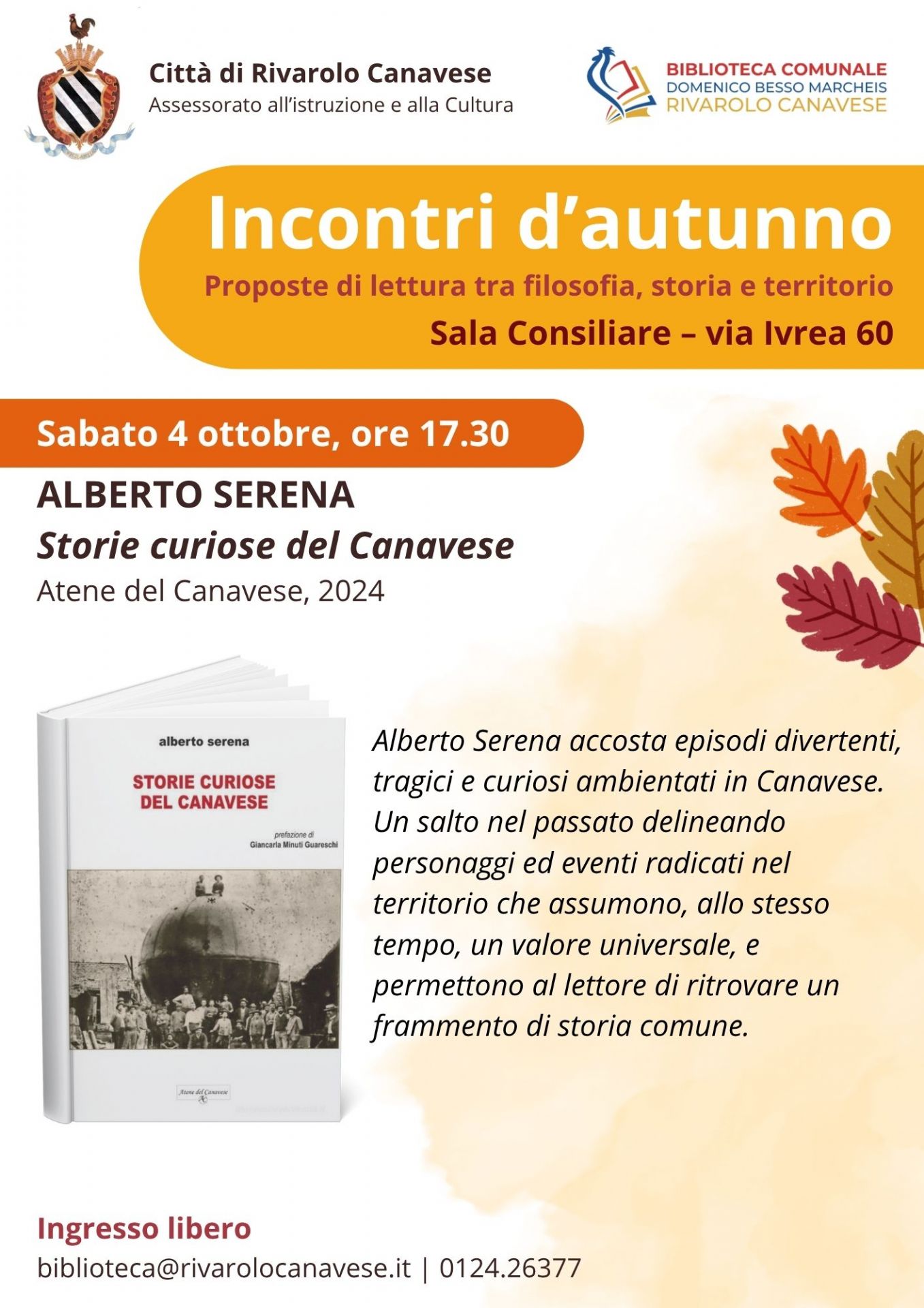 Sabato 4 ottobre alle 17.30, presso la Sala consiliare del Municipio, Alberto Serena presenterà “Storie curiose del Canavese”: una raccolta di racconti edita da Atene del Canavese nel 2024 con episodi divertenti, tragici e curiosi che rievocano personaggi e situazioni tra storia locale e immaginario collettivo.