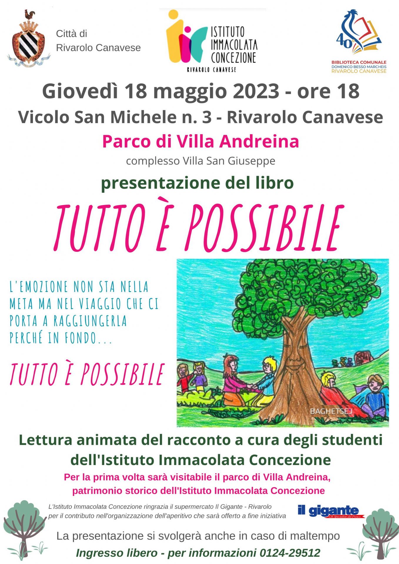 Giovedì 18 maggio, alle ore 18, presso il parco di Villa Andreina in Vicolo San Michele 3 a Rivarolo Canavese, gli studenti della scuola primaria paritaria “Istituto Immacolata Concezione” presenteranno il racconto Tutto è possibile, incentrato sui temi del rispetto reciproco e della lotta al bullismo.