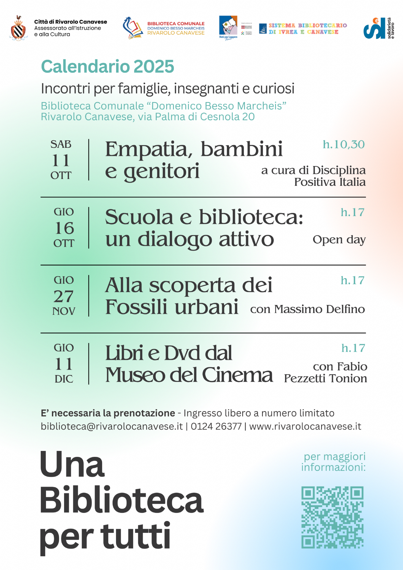 Gli incontri sono ad ingresso libero, con numero limitato di posti: è richiesta prenotazione a biblioteca@rivarolocanavese.it – 012426377 – ingresso via Palma di Cesnola.