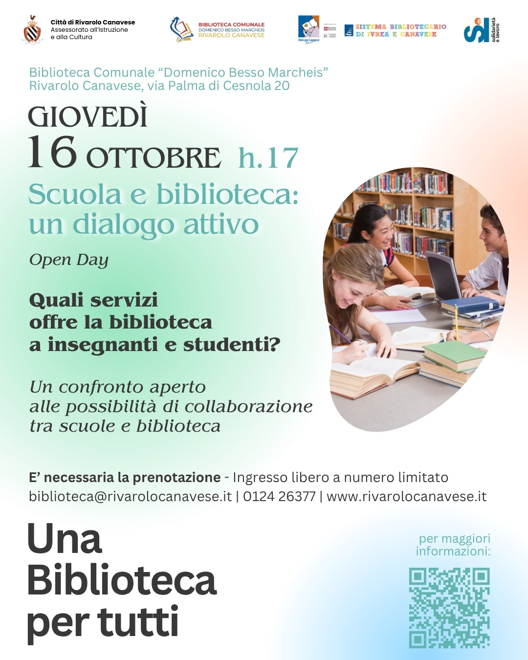 L'Assessorato all'Istruzione e alla Cultura della Città di Rivarolo Canavese promuove il ciclo di incontri "Una Biblioteca per tutti": quattro appuntamenti presso la Biblioteca comunale "Domenico Besso Marcheis" dedicati a famiglie, insegnanti, studenti e curiosi.