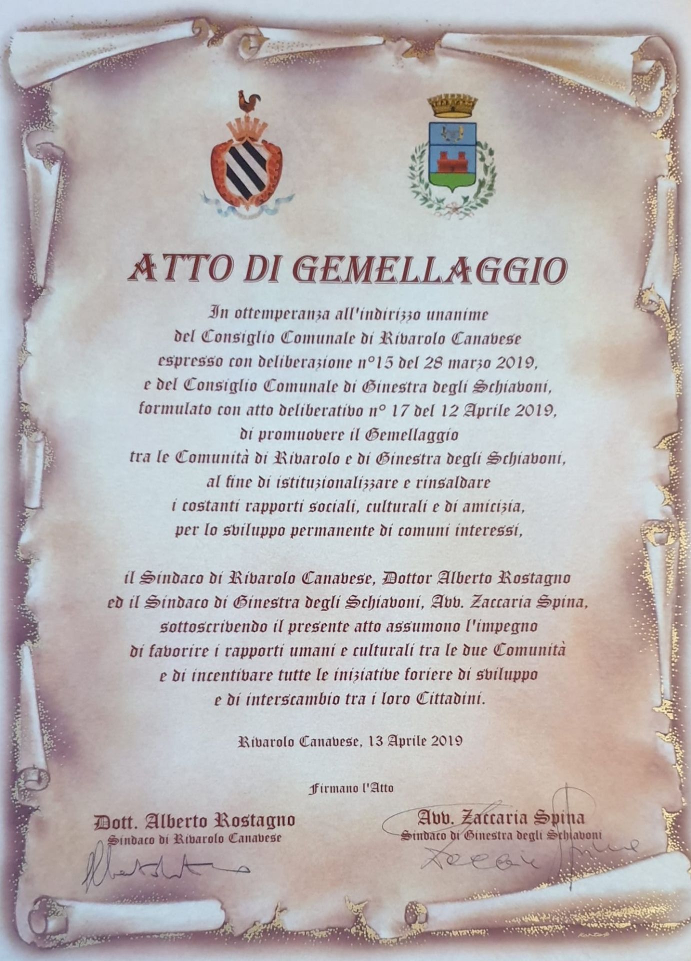 Al fine di istituzionalizzare e rinsaldare i costanti rapporti sociali, culturali e di amicizia per lo sviluppo permanente di comuni interessi, il sindaco di Ginestra degli Schiavoni, Zaccaria Spina, accompagnato dal suo vice Edi Barile e dal consigliere Leopoldo Martucci, si è recato a Rivarolo Canavese per la sottoscrizione dell’Atto di Gemellaggio tra i due Municipi e le due comunità.