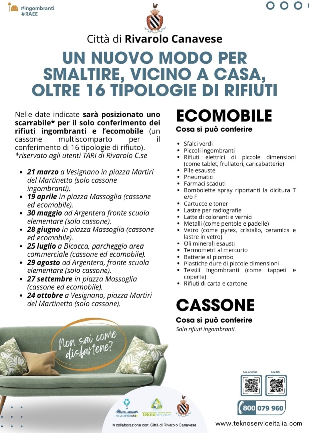 Per iniziativa della Città di Rivarolo Canavese in collaborazione con Teknoservice, il Comando della Polizia municipale e l'Associazione Guardie Ambientali d'Italia, tornano le giornate di raccolta straordinaria dei rifiuti ingombranti e altre tipologie di rifiuti, in Città e Frazioni.