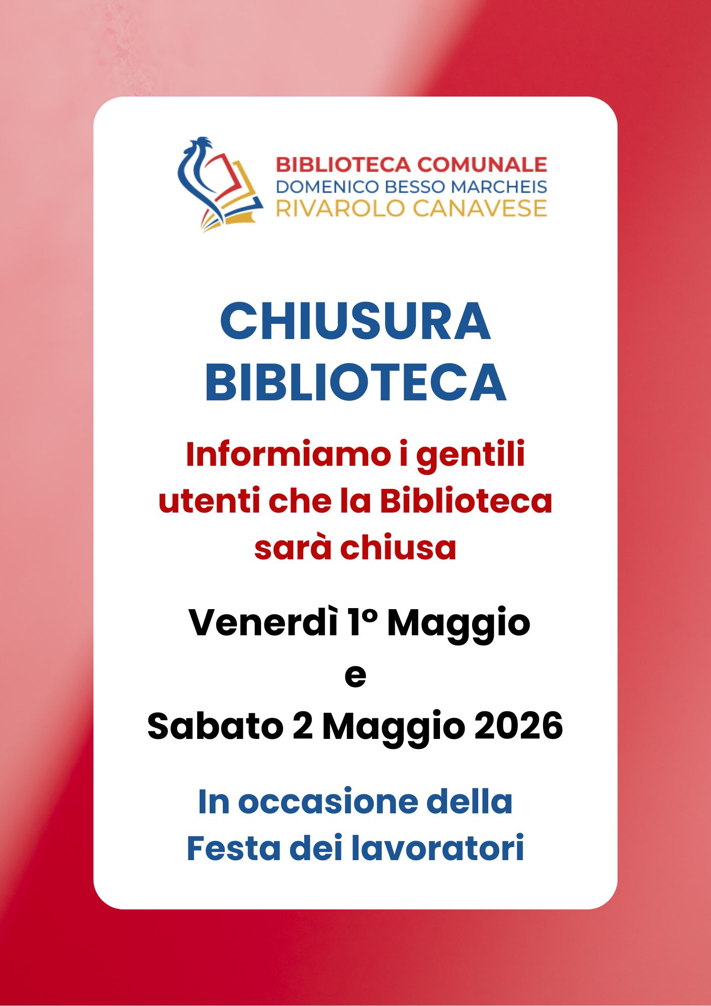La Biblioteca comunale "Domenico Besso Marcheis" sarà chiusa al pubblico venerdì 1° maggio e sabato 2 maggio 2026.