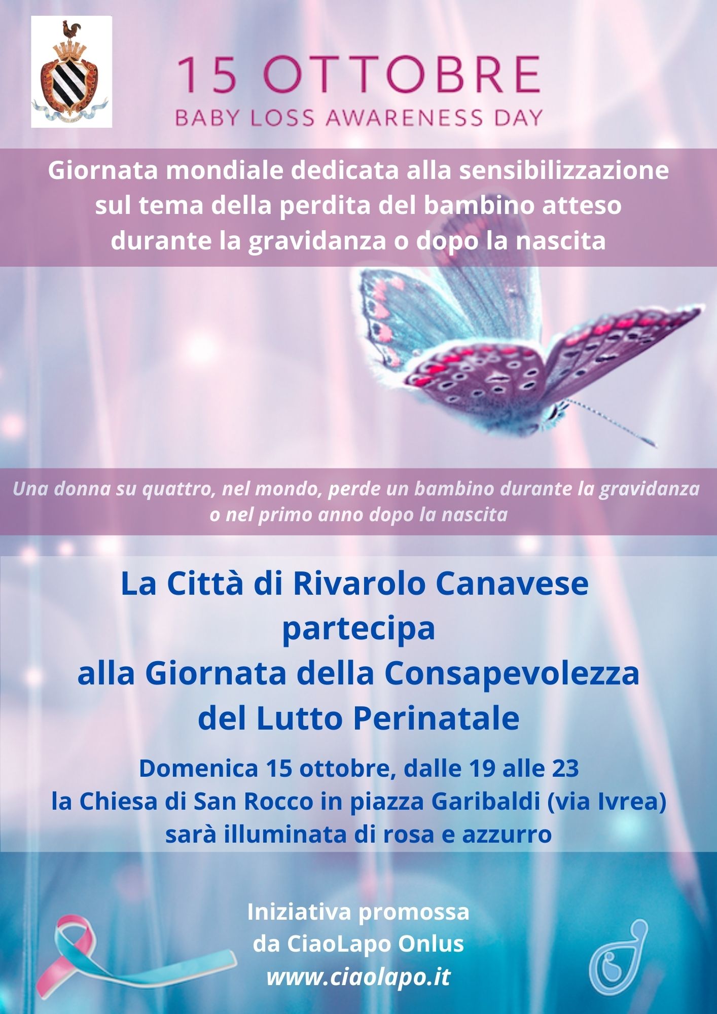 Domenica 15 ottobre, fino alle ore 23 la facciata della Chiesa di San Rocco e San Carlo Borromeo in piazza Garibaldi (via Ivrea), sarà illuminata in rosa e azzurro: è il segno di adesione della Città di Rivarolo Canavese alla Giornata Mondiale per la consapevolezza del lutto perinatale.
