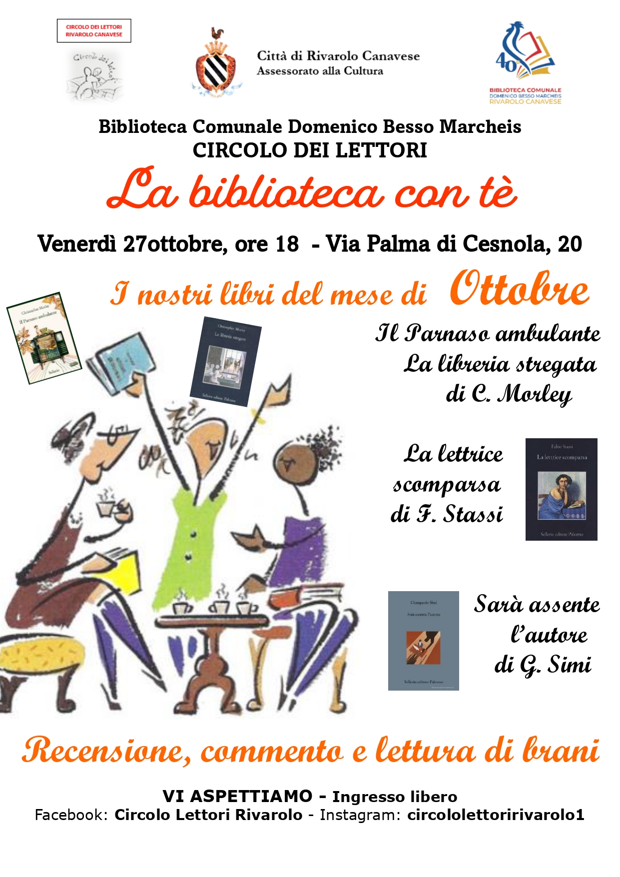 Venerdì 27 ottobre alle ore 18, presso la Biblioteca comunale “Domenico Besso Marcheis” in via Palma di Cesnola, il Circolo dei Lettori proporrà il primo appuntamento della rubrica “I libri del mese” con brani da La lettrice scomparsa di Fabio Stassi, Il parnaso ambulante e La libreria stregata di Christopher Morley e Sarà assente l’autore di Giampaolo Simi.