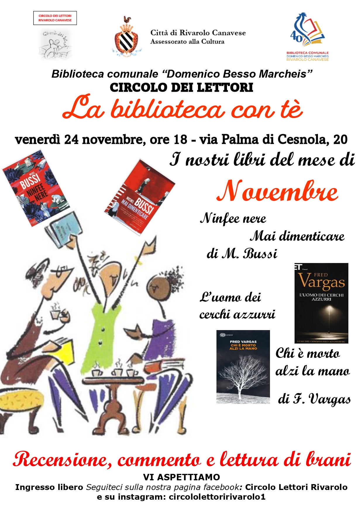 Presso la Bibliotecao comunale "Domenico Besso Marcheis", in via Palma di Cesnola 20, venerdì 24 novembre alle ore 18,00 secondo appuntamento con la rubrica del Circolo dei Lettori della Biblioteca dedicato ai libri del mese. Saranno presentati Ninfee nere e Mai dimenticare del giallista Michel Bussi, che ambienta spesso i suoi romanzi nella natia Normandia, e L’uomo dei cerchi azzurri e Chi è morto alzi la mano della scrittrice parigina Fred Vargas.