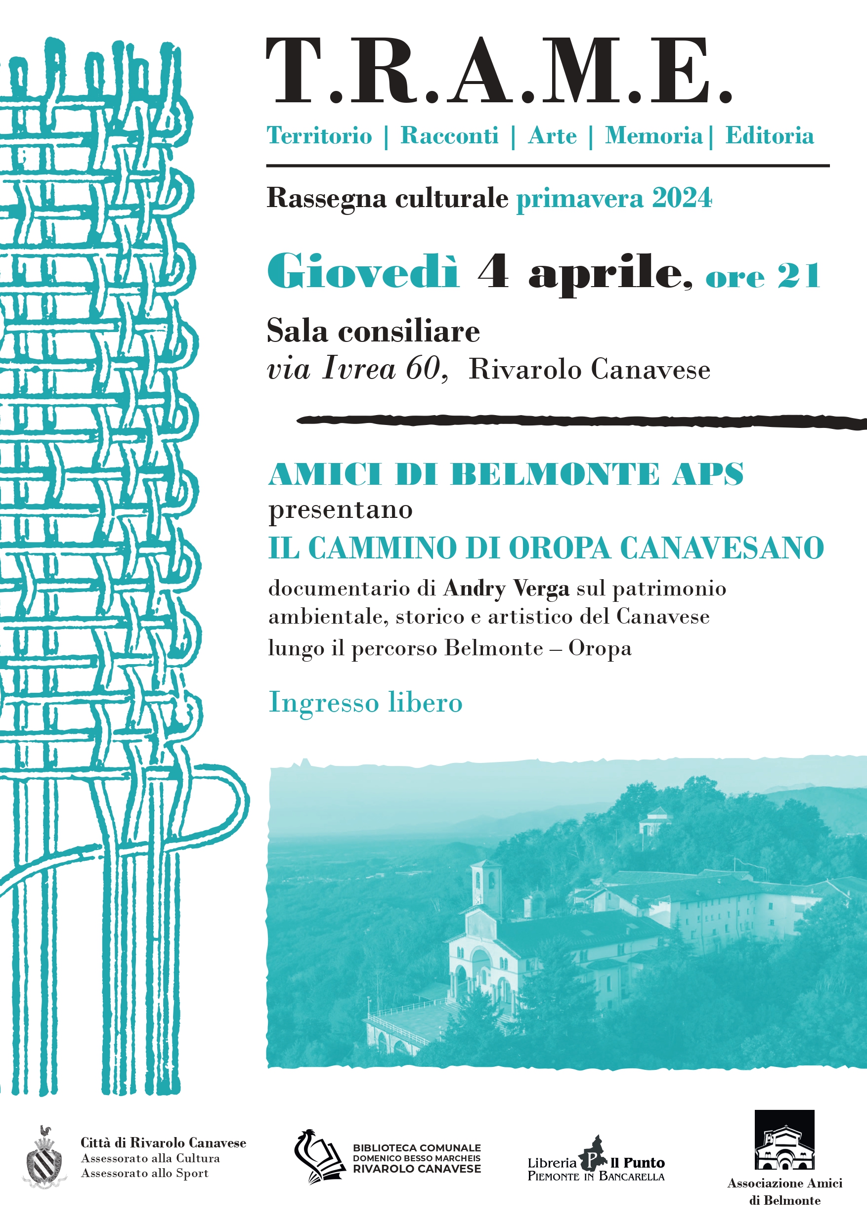 Il primo appuntamento della Rassegna culturale "T.R.A.M.E" sarà giovedì 4 aprile 2024 alle ore 21 presso la Sala consiliare della Città di Rivarolo Canavese (via Ivrea 60).