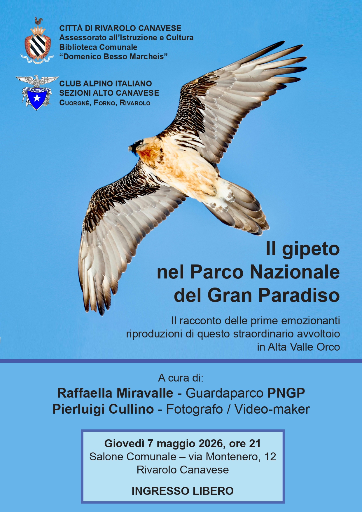 A Rivarolo Canavese, giovedì 7 maggio 2026 alle ore 21, presso il salone comunale di via Montenero 12, si terrà la conferenza “IL GIPETO NEL PARCO NAZIONALE DEL GRAN PARADISO”: Raffaella Miravalle, Guardaparco P.N.G.P., e Pierluigi Cullino, Fotografo/videomaker, racconteranno le prime emozionanti riproduzioni di questo straordinario avvoltoio in Alta Valle Orco.