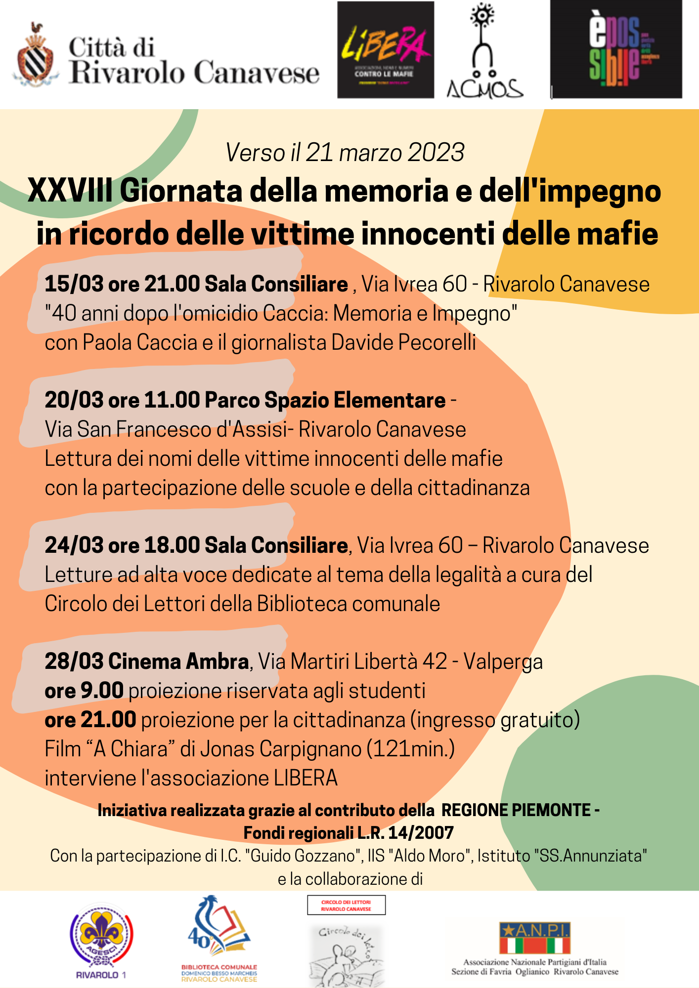 Mercoledì 15 marzo 2023 – ore 21.00 Sala Consiliare, Via Ivrea n. 60 – Rivarolo Canavese “40 anni dopo l’omicidio Caccia: Memoria e Impegno” con Paola Caccia e Davide Pecorelli, giornalista. Lunedì 20 marzo 2023 – ore 11.00 Parco Spazio...